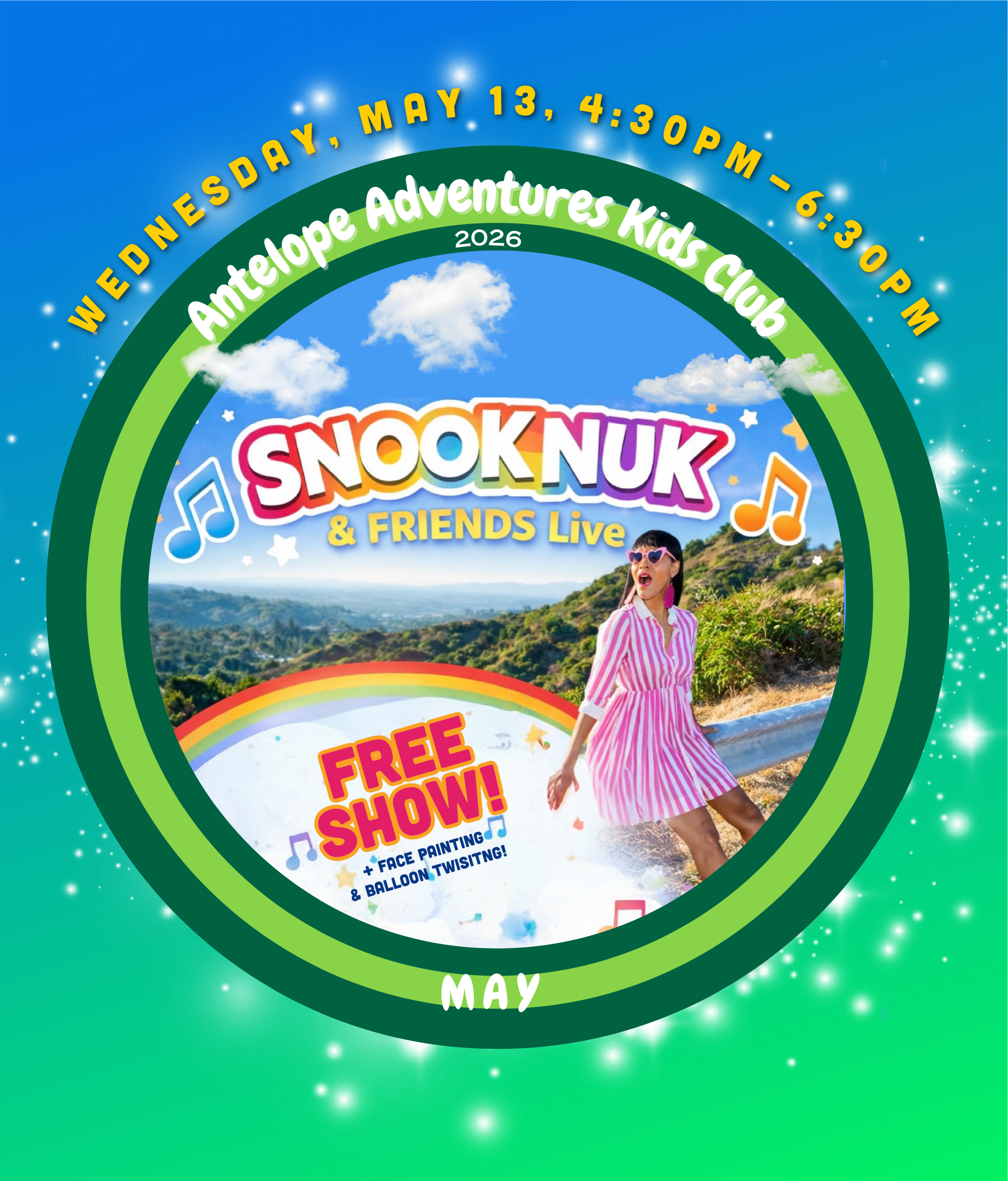 Join us for May Kids Club as we welcome Snooknuk & Friends LIVE on Wednesday, May 13th! SnookNuk and Friends Live! is a festive, high-energy experience filled with fun props like streamers, scarves, drums, shakers, and parachutes that make every moment engaging. A blend of classic toddler tunes with vibrant kinder-pop and even a touch of Motown, ensuring that both kids and parents are entertained and inspired.